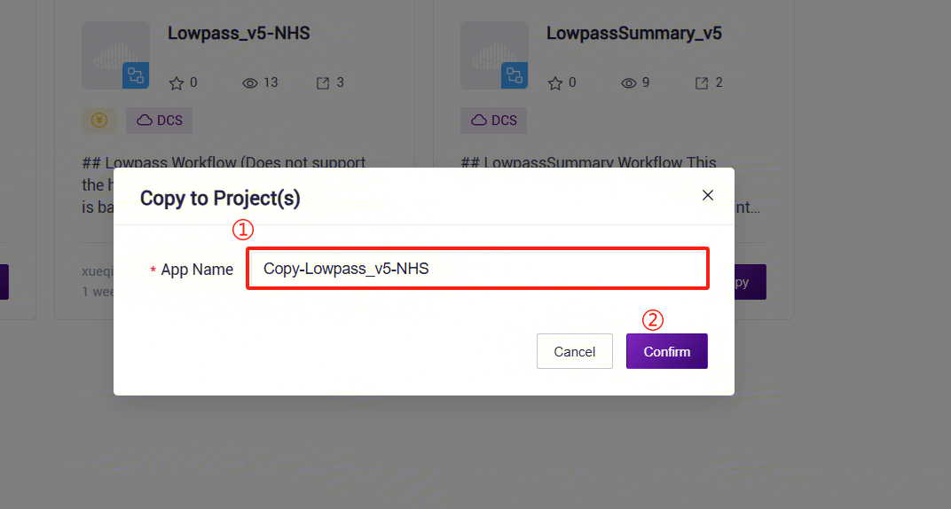 - EnterLowpassin the search box , selectLowpass_v5, click 【Copy】 to go to the next step, and then select again LowpassSummary_v5, click 【Copy】 , skip to step 5 ( Figure 3-5 ) :