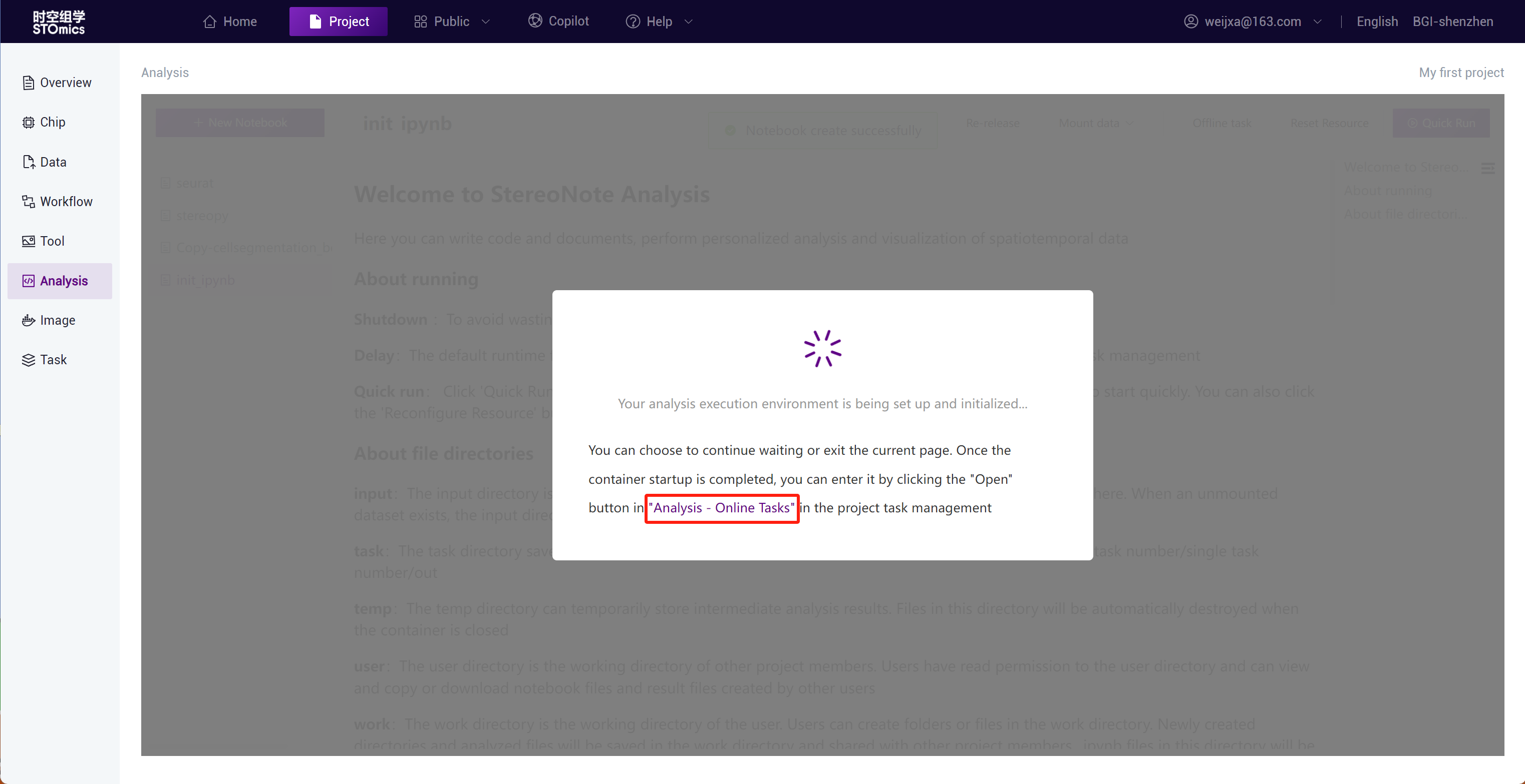 If the image resource is too large, the analysis container may take a long time to start. You can click on "Data Analysis ‑ Online Tasks" on the startup prompt page to jump to the "Task Management" module's "Data Analysis ‑ Online Tasks" section.