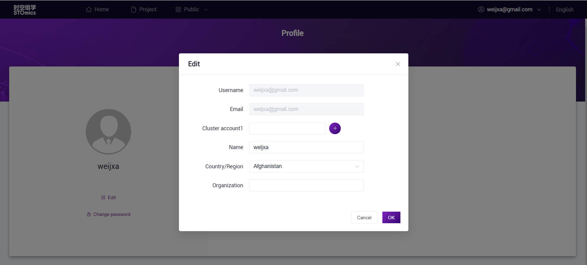 If you need to modify your personal information, you can enter the 'Profile' through the dropdown option under your username, and click "Edit" to change your personal details.
