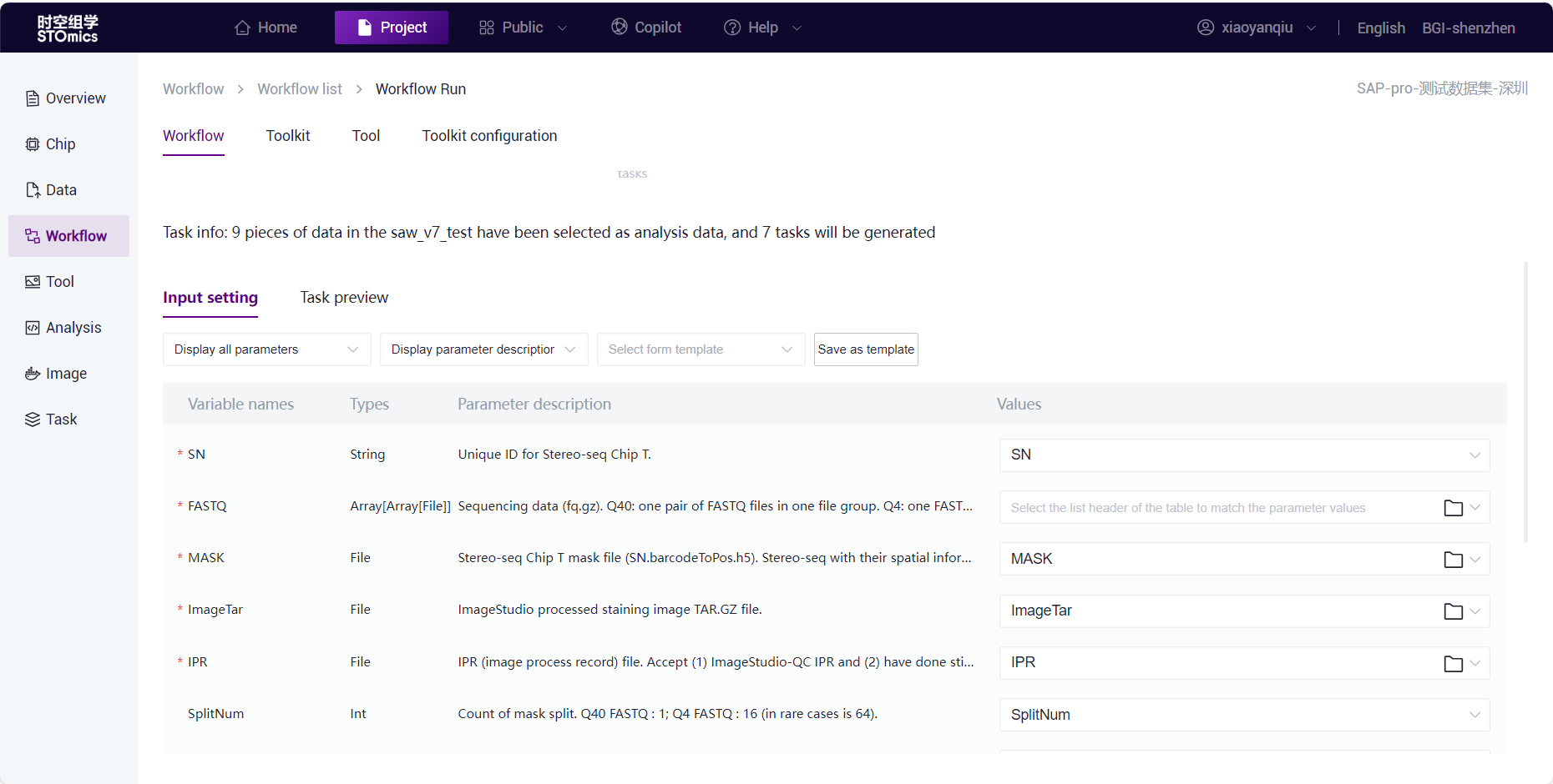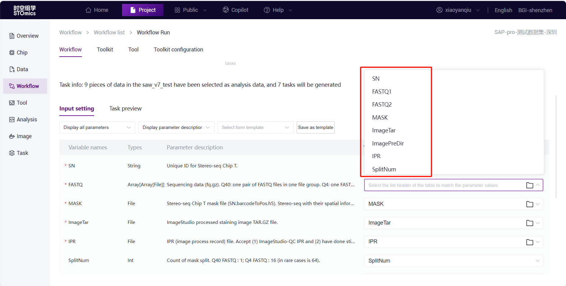 When using the "STOmics chip data" to submit SAW-ST-V7 and SAW-ST-V6, in the"Task preview" interface: